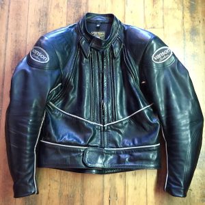 Triumph Triple Collection perforated leather jacket with black and white checkered flag detailing. Great condition, armored in the elbows and shoulders, and just a hint of “distinguished gentleman” style. Size 44 US.